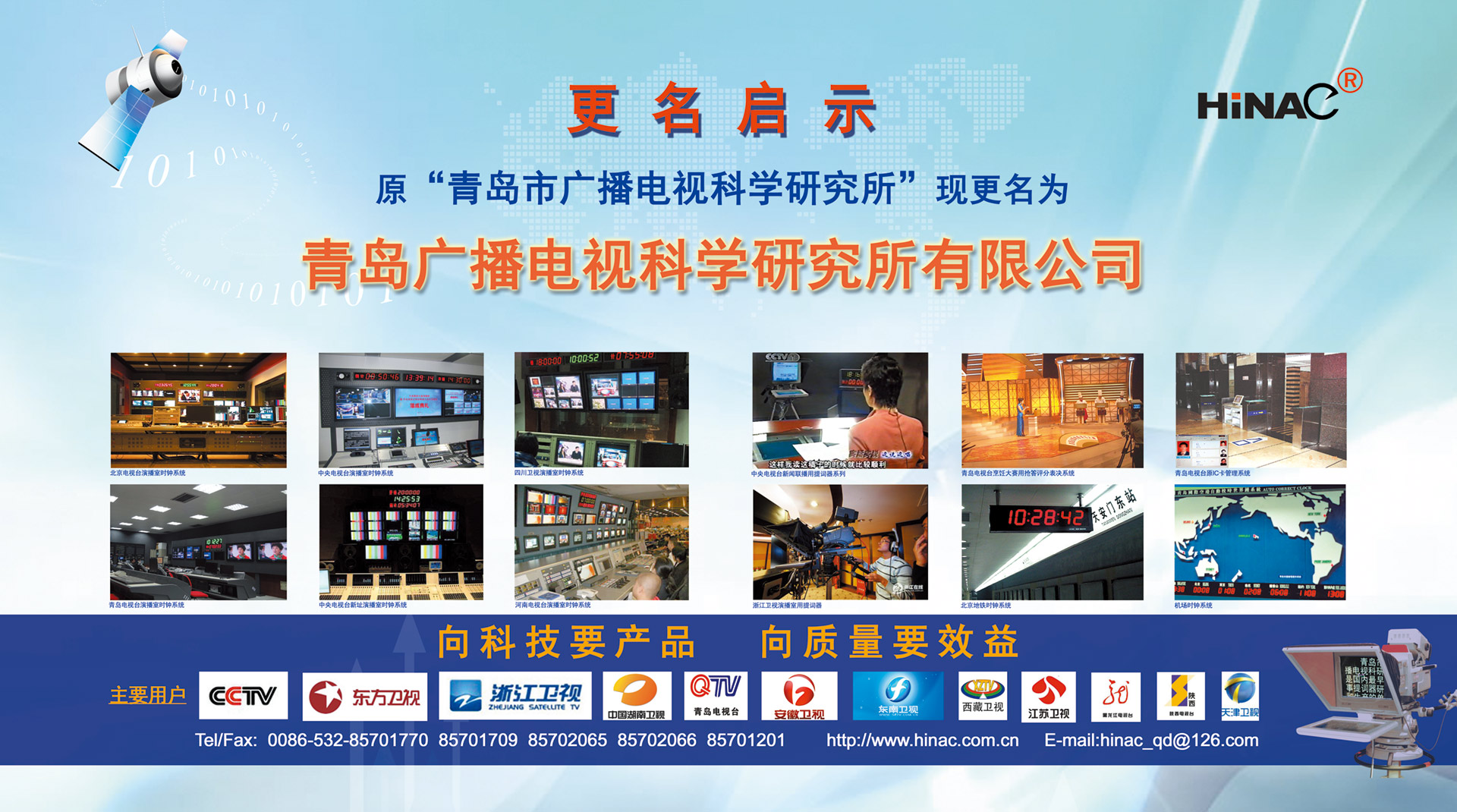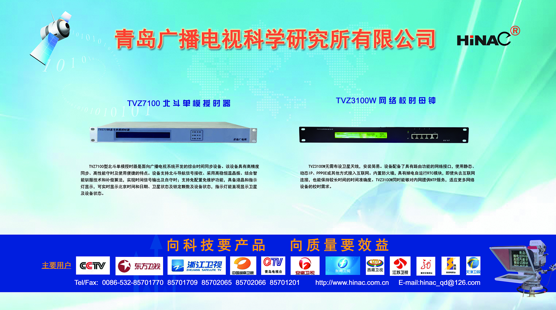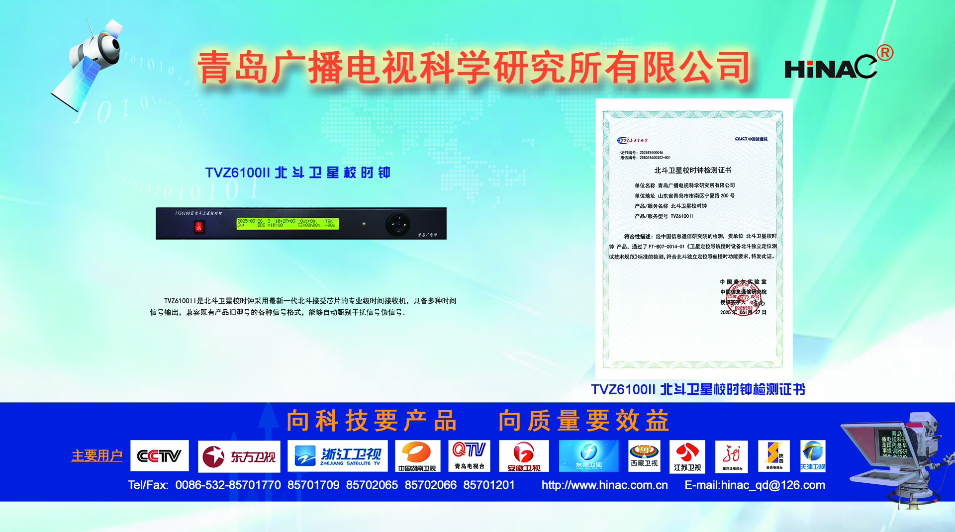25年不悔的執(zhí)著追求! 25年不懈的專業(yè)堅持! 青島廣播電視科學(xué)研究所有限公司(簡稱青島廣電所)以其對廣電科技事業(yè)無限的熱愛,以及為爭做中國最優(yōu)秀廣電產(chǎn)品供應(yīng)商的美好理想,25年如一日,深耕廣電設(shè)備這塊沃土,已經(jīng)形成且被市場高度認(rèn)可的成果有: TVZ系列GPS/北斗自動校時鐘系統(tǒng) TC系列電視播音提詞器及電視直播系統(tǒng)整體解決方案 TL系列泰麗訊源指示系統(tǒng) QD系列搶答表決評分系統(tǒng) IC系列廣電一卡通管理系統(tǒng) 同時向:廣電設(shè)備集成商、地鐵輕軌信號系統(tǒng)設(shè)備供應(yīng)商及其它業(yè)務(wù)方向創(chuàng)新、拓展、前行! 青島廣電所在國家廣電傳媒事業(yè)不斷發(fā)展的今天,愿意和您攜手并進,為我們共同的事業(yè)發(fā)展添磚加瓦開拓創(chuàng)新。愿意和您一道,把工作中的一個奇思妙想轉(zhuǎn)變?yōu)橐豁梻?..